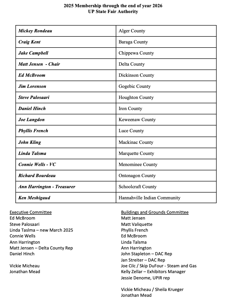 The fair is now governed by the Upper Peninsula State Fair Authority with representatives from all fifteen counties in the Upper Peninsula and the Hannahville Indian Community.