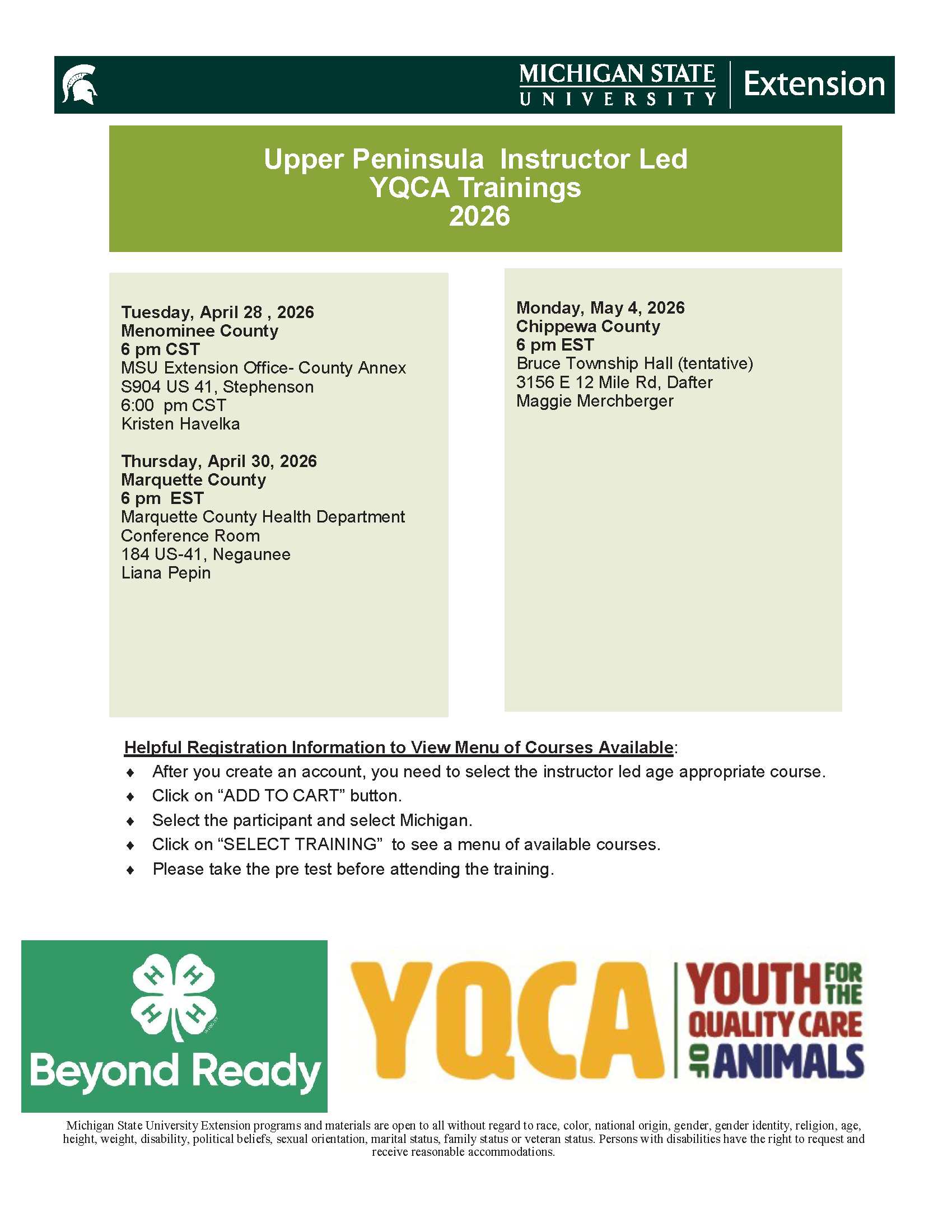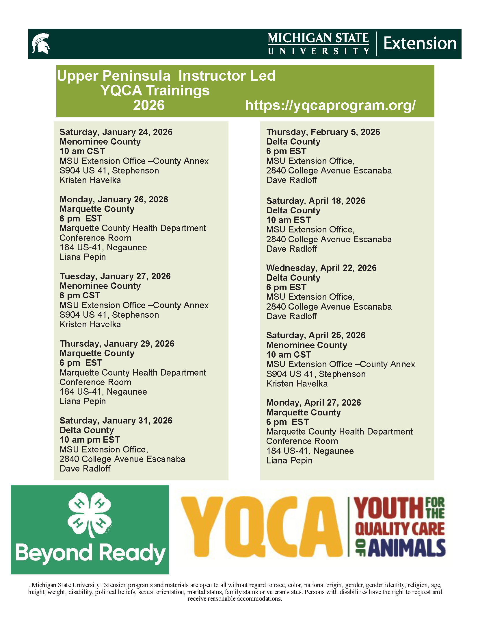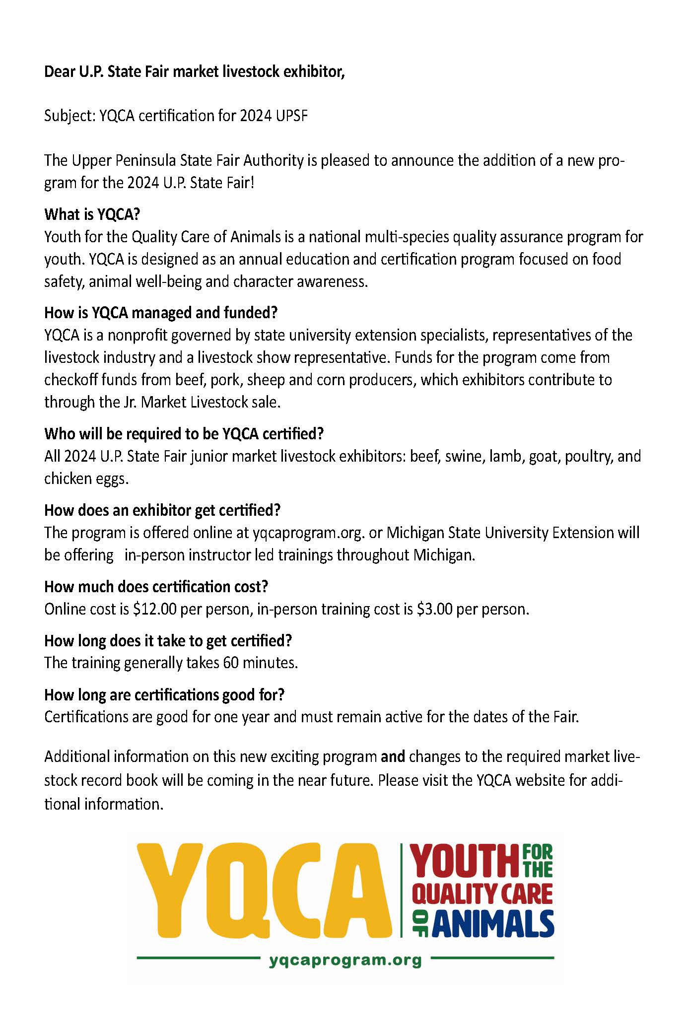 YQCA certificates must accompany DNA samples. They may be delivered to the fair office @ 1001 N. Lincoln Rd. Escanaba OR be postmarked by the deadlines below. A copy of your certificate must accompany each DNA sample. Attention to Exhibitors Manager.